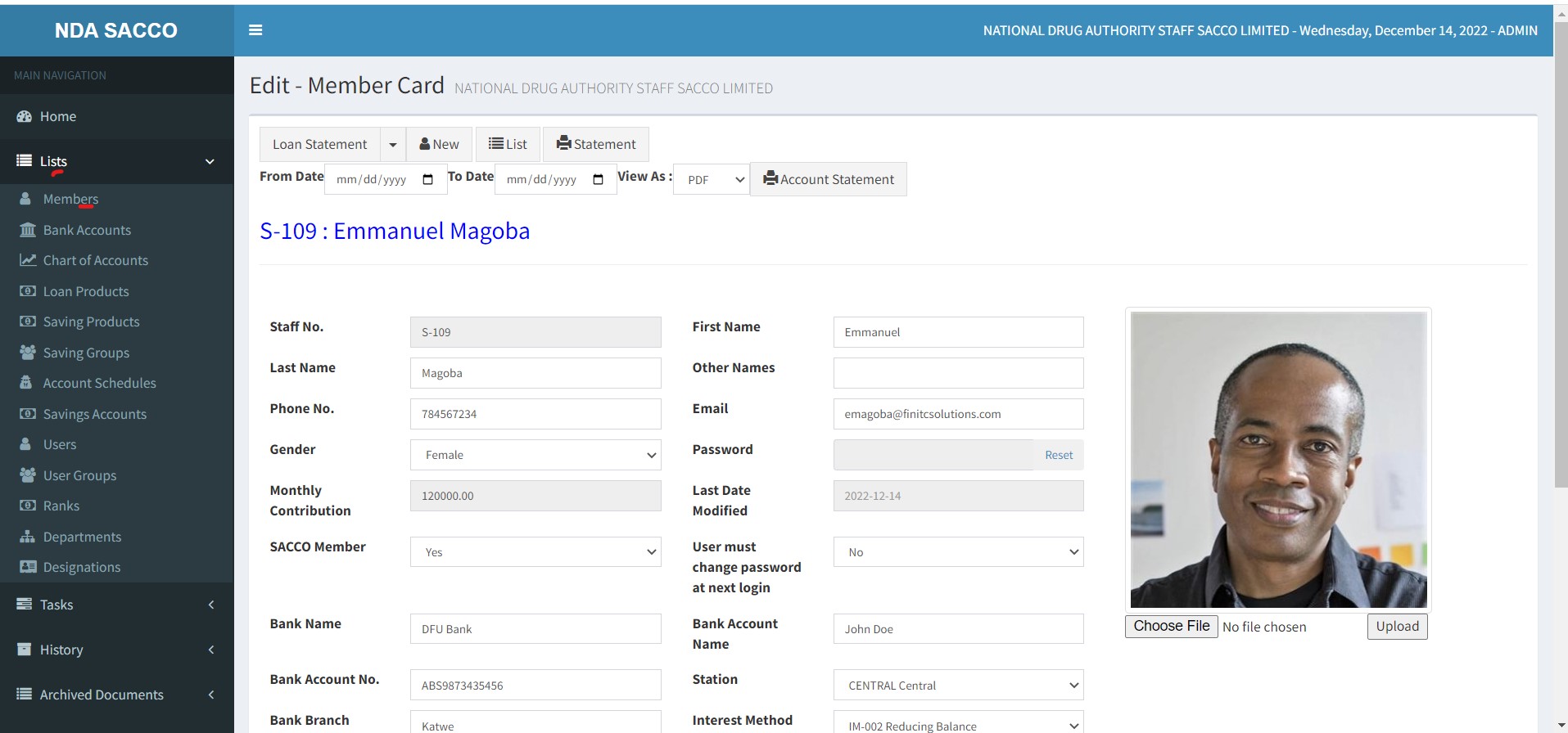Member Accounts are created by the Sacco Administrators by clicking Lists > Members > New.