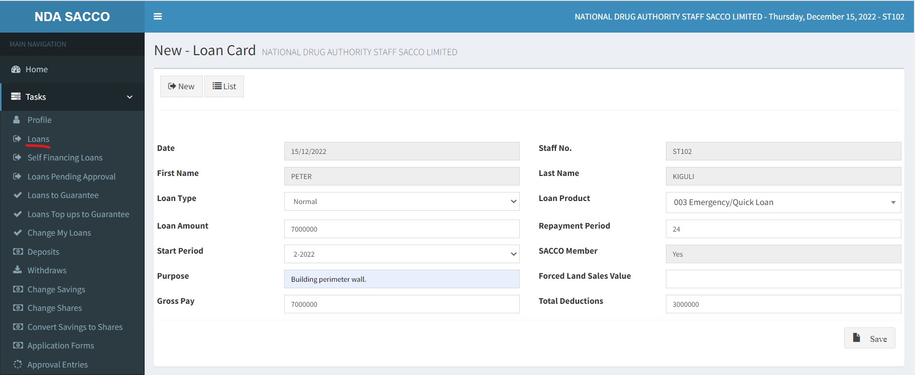 Enter the Loan Amount, Repayment Period, Start Deduction Period, Purpose of the Loan, Gross Pay and Total Deduction and then click the save button.