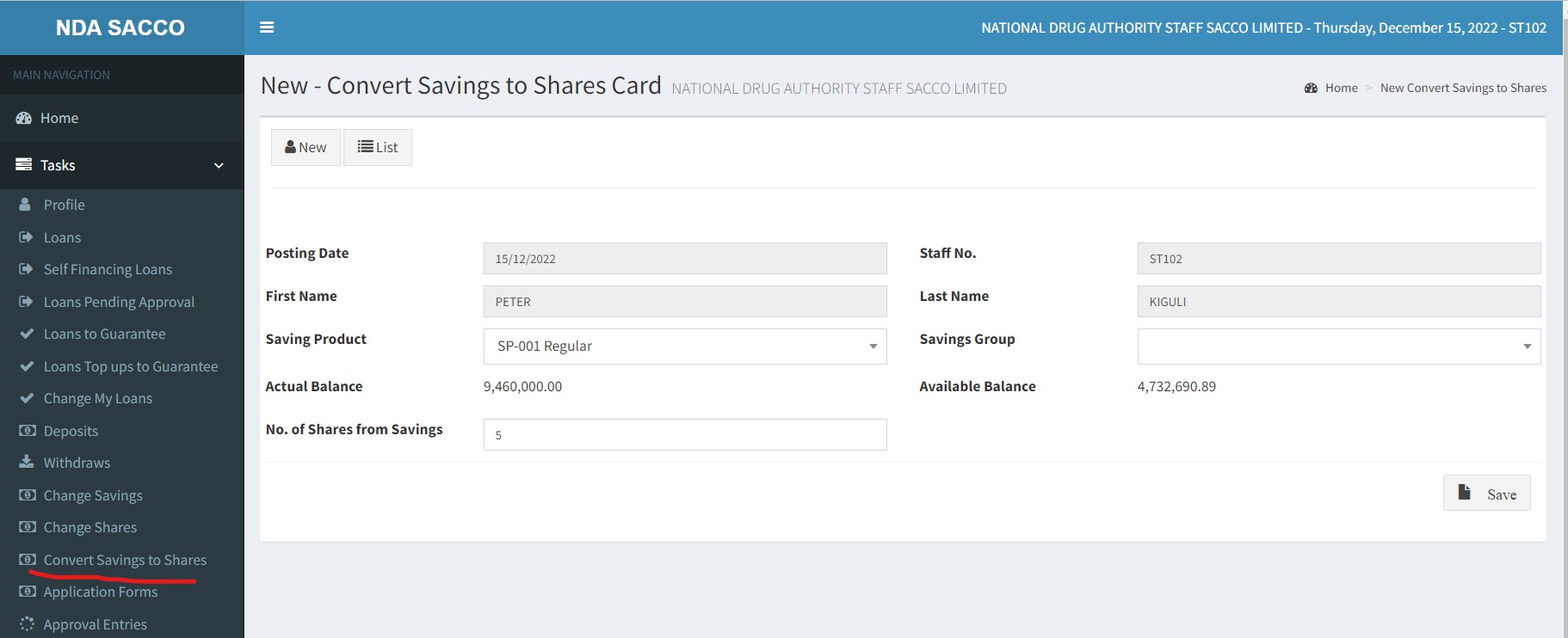 Select the saving product and enter the No. of Shares to buy from the Savings. Save the record and send it for approval.