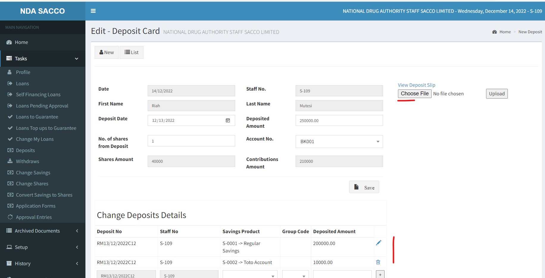 Alternatively, the SACCO member can also register the transaction by clicking "Tasks > Deposits" and then selecting.