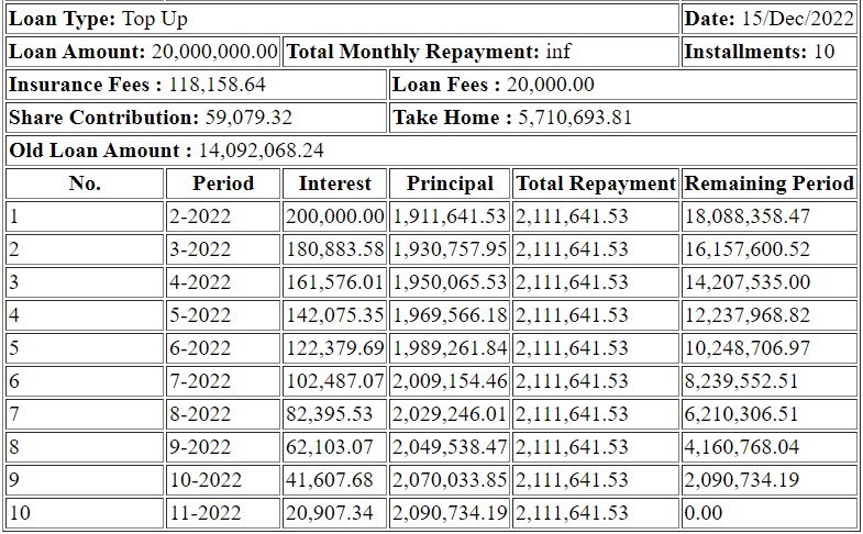 Below is a sample of a loan schedule with a member who has an outstanding loan of 14,092,068.24 and applied for a top-up of 20,000,000. Part of the top-up was used to cover the previous loan.
