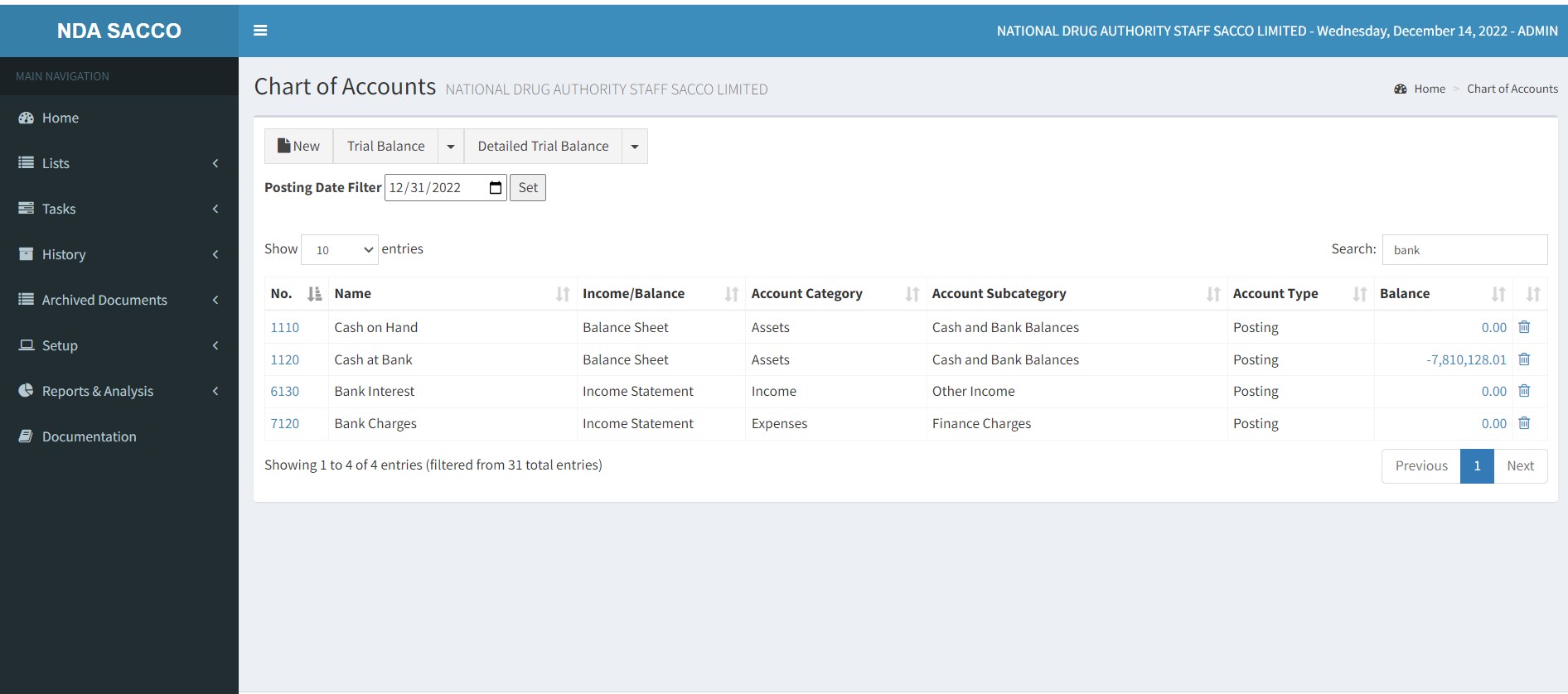 You use the filter box to display accounts, members, entries, or other records by specifying criteria for fields in a table. The example below searches and filters out all G/L accounts with a word Bank
