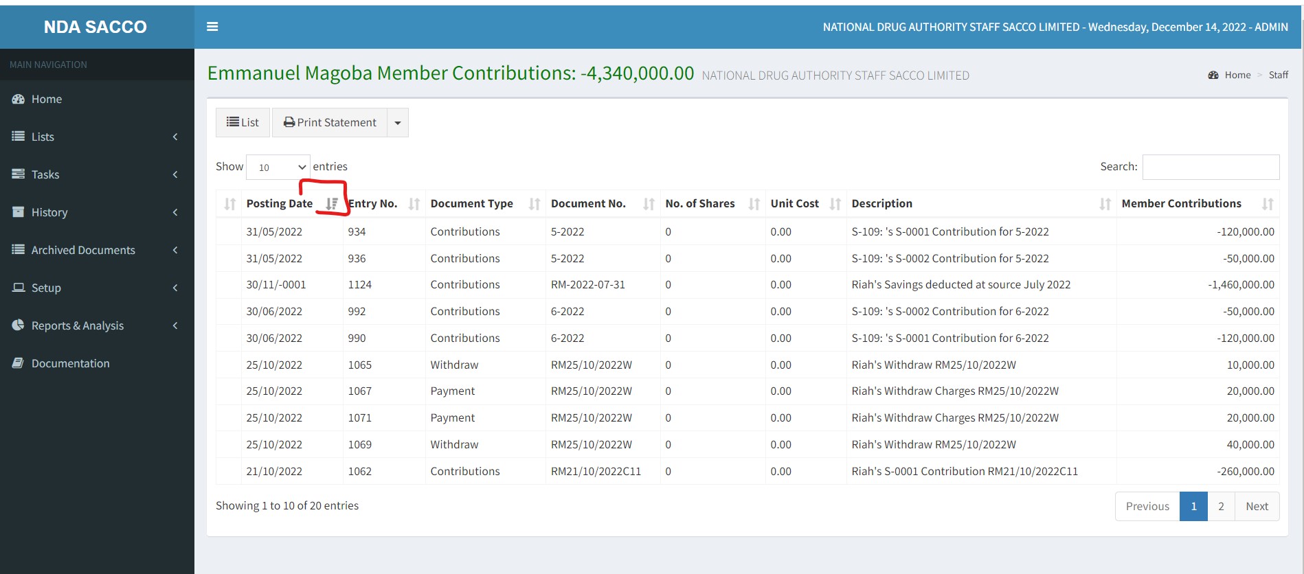 With the sorting functionality in System, you can decide the order in which information is displayed. For example, if you have many general ledger entries, you can choose to order them by one of the available fields. To change the sorting order of a list, Click the up and down arrows next to the field to sort by that specific field.